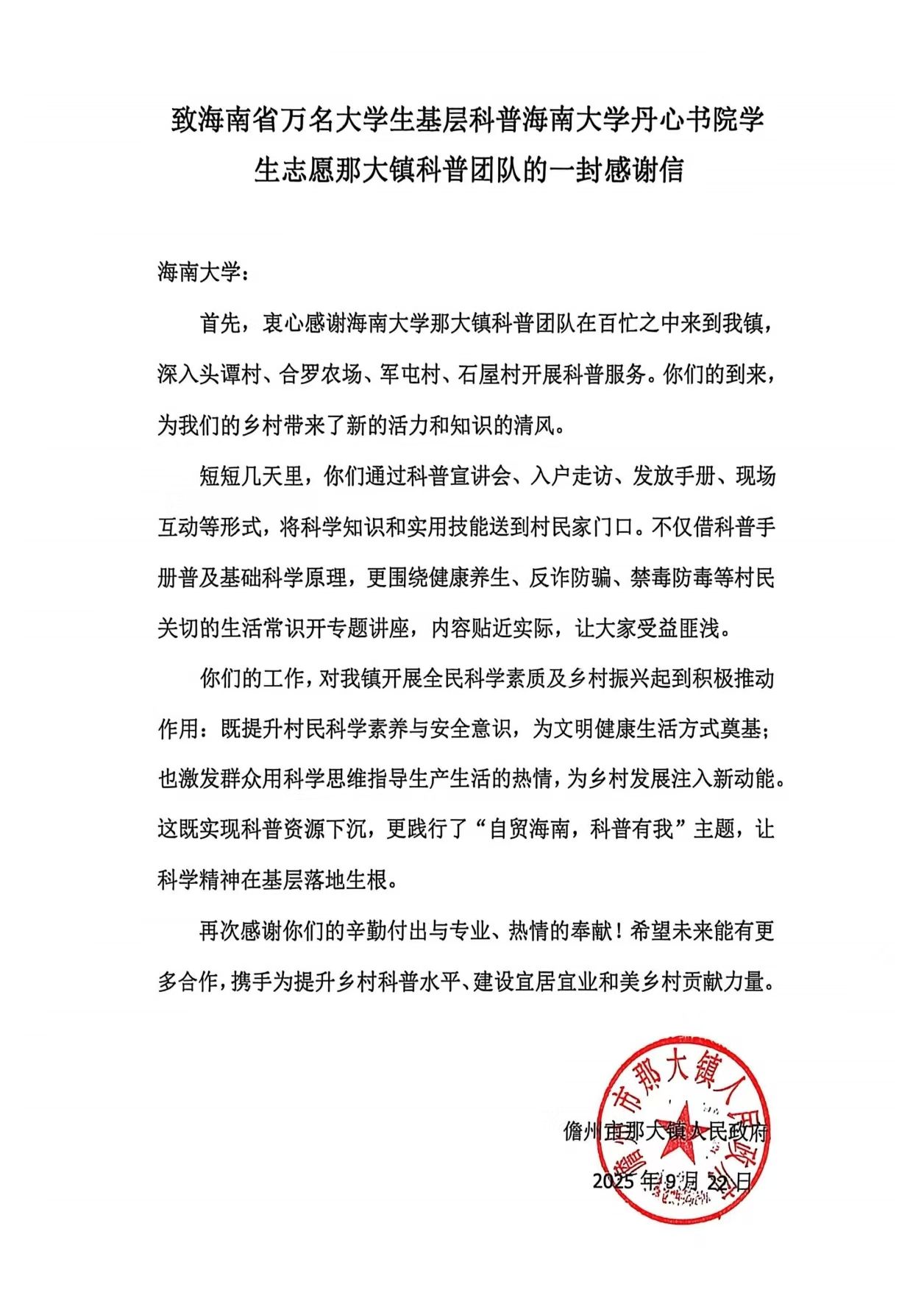 【儋州市那大镇人民政府】致海南省万名大学生基层科普海南大学丹心书院学生志愿那大镇科普团队的一封感谢信