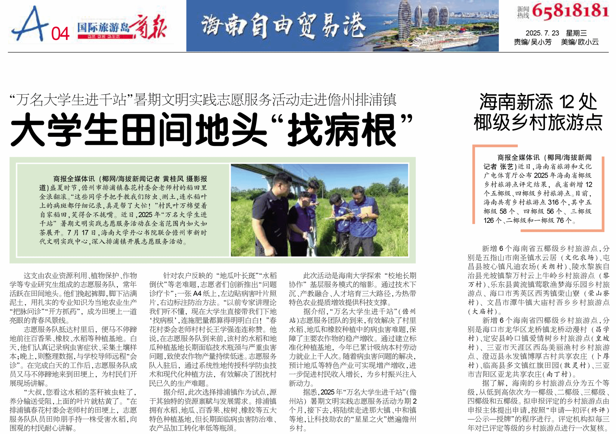 【国际旅游岛商报】“万名大学生进千站”暑期文明实践志愿服务活动走进儋州排浦镇 大学生田间地头“找病根”