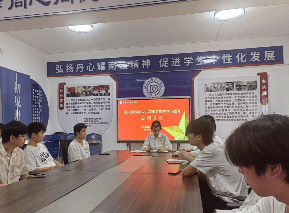2025年9月29日中午,海南大学丹心书院第一党支部在党员之家A9栋101室召开深入贯彻中央八项规定精神学习教育总结会议。本次会议旨在持续巩固深入贯彻中央八项规定精神学习教育成果,进一步引导支部全体党员及积极分子强化纪律意识、锤炼过硬作风。