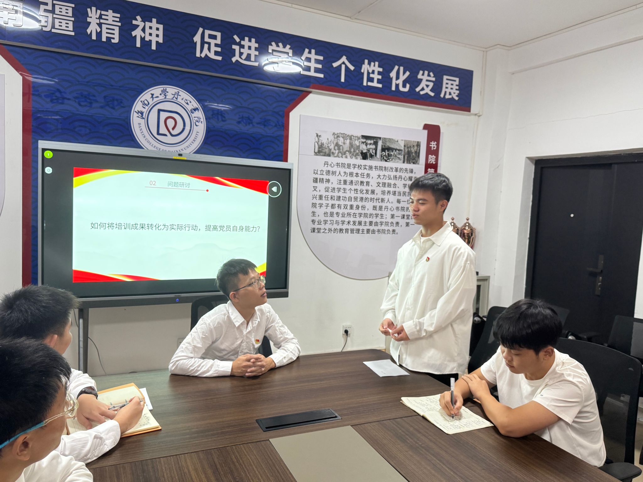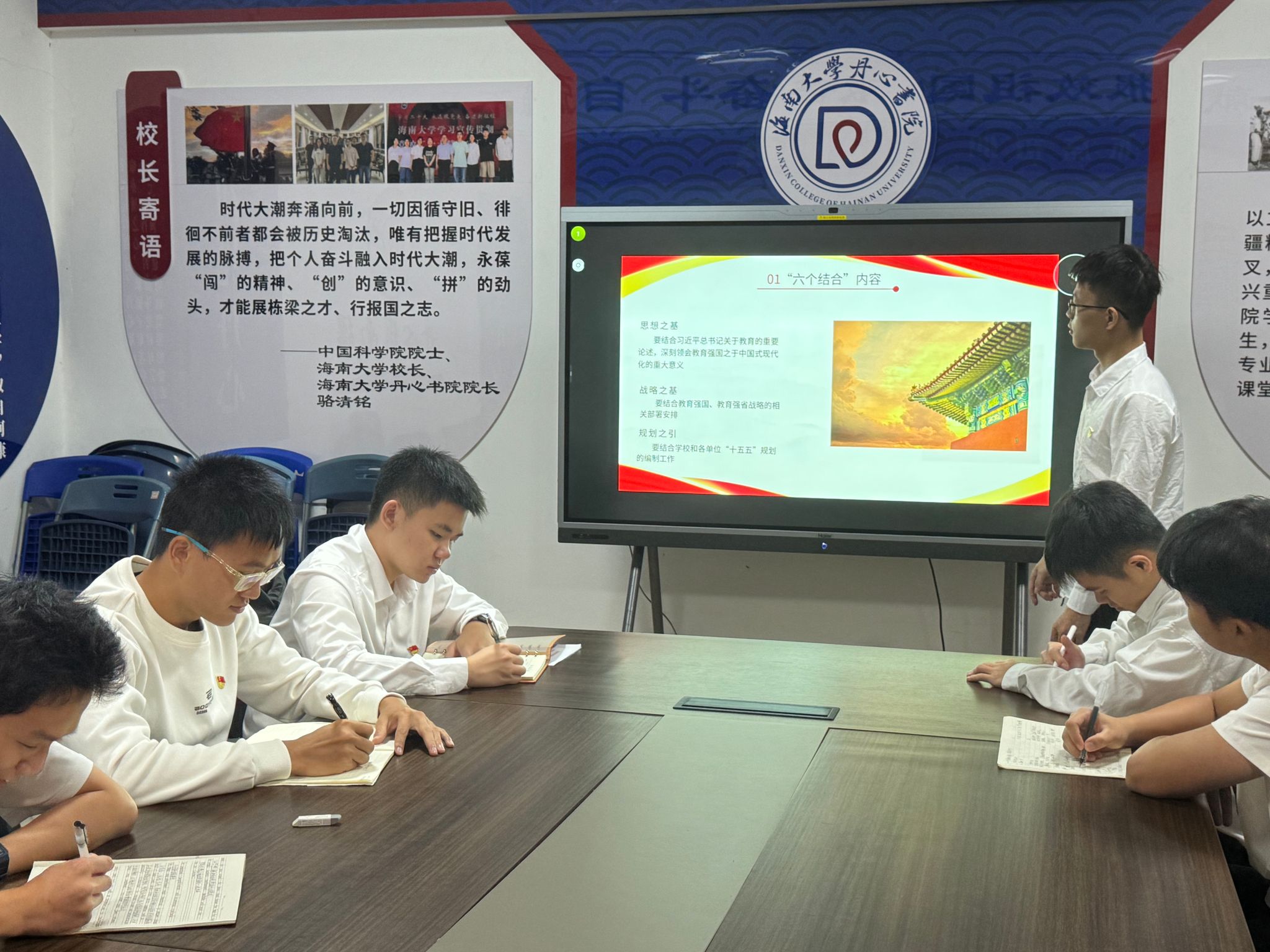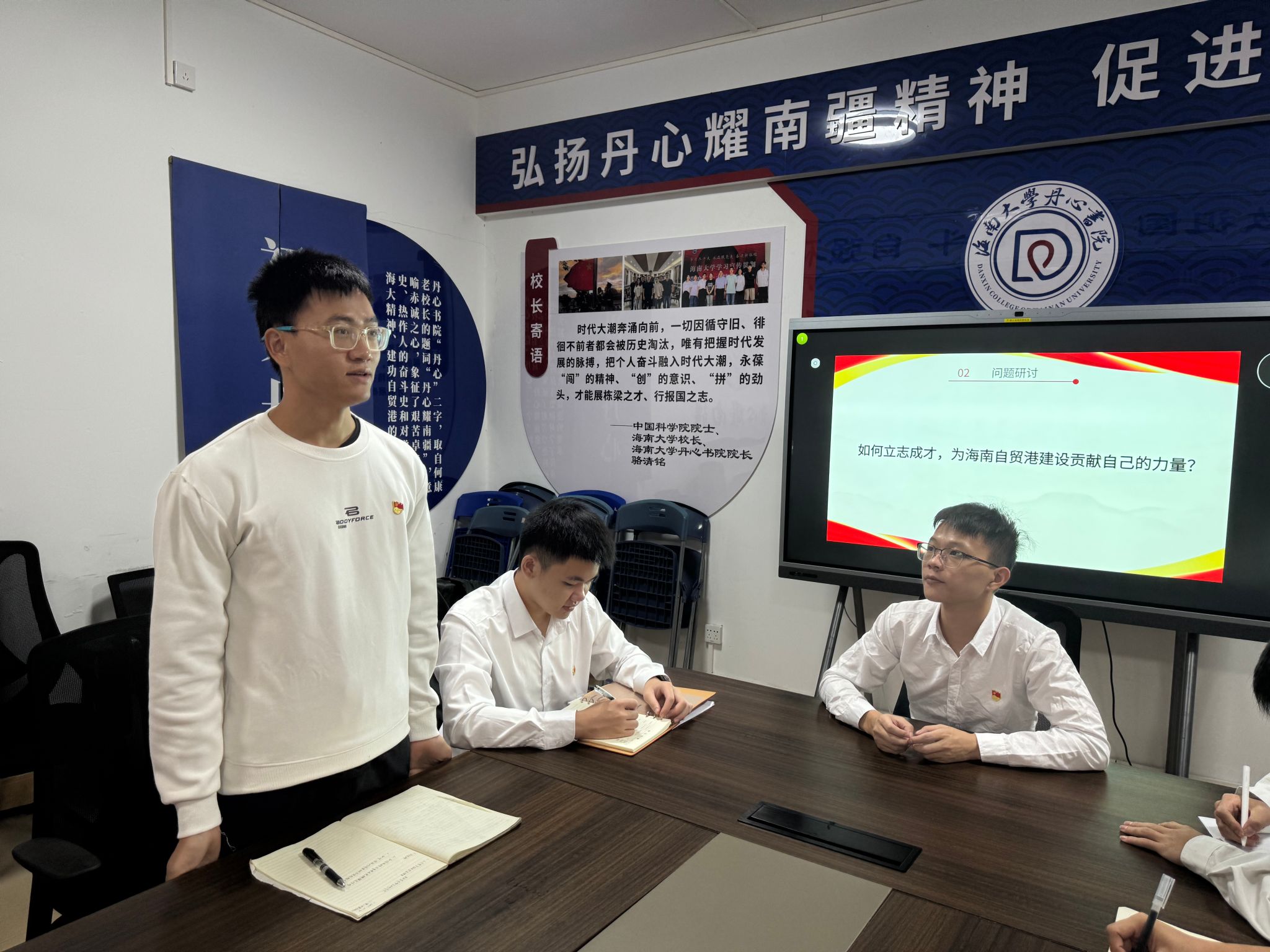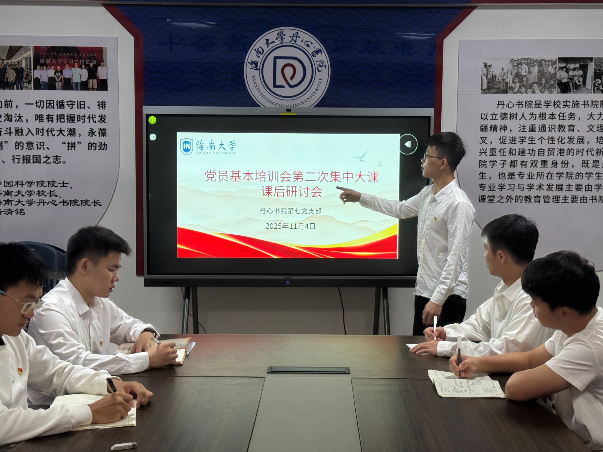 2025年11月4日,海南大学丹心书院第七党支部于A9-101党员之家召开党员基本培训会第二次集中大课课后交流研讨会。全体党员紧扣培训核心与“六个结合”实践要求,共话学习心得、共谋实践路径。支部书记张子宇带领全体党员参加会议。