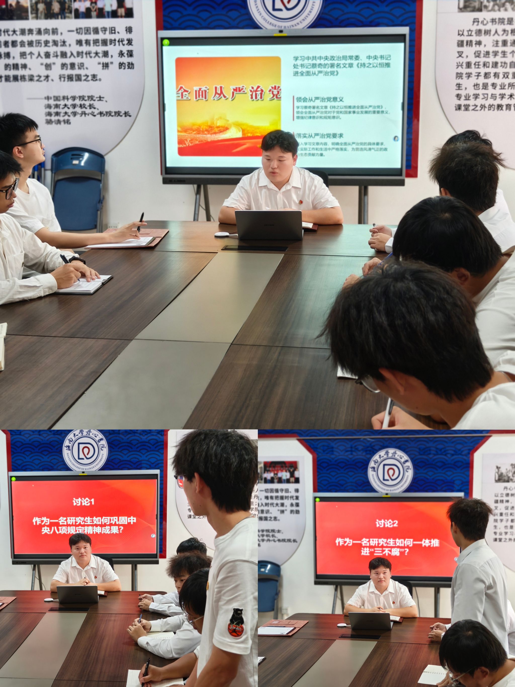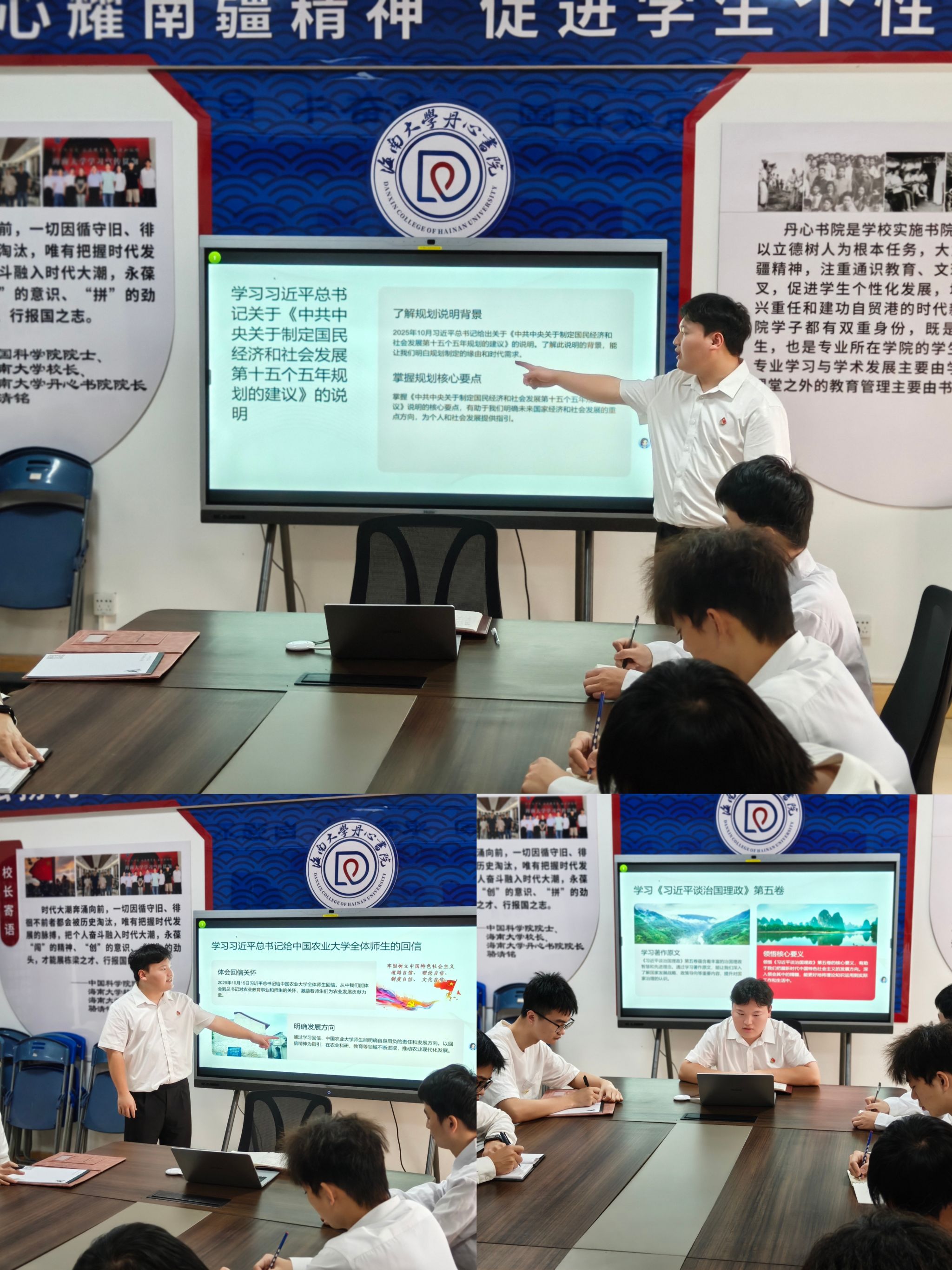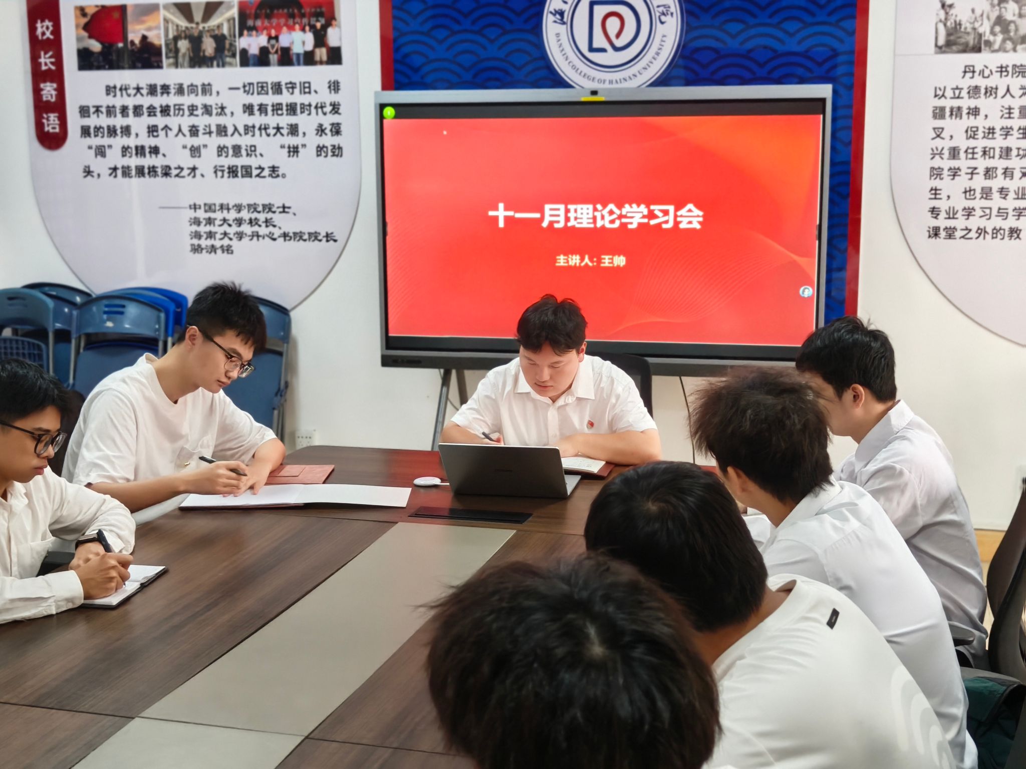 2025年11月12日上午,海南大学丹心书院第六党支部在丹心书院A9-101召开了召开十一月理论学习会。全体党员集中学习习近平新时代中国特色社会主义思想和党的二十届四中全会精神,通过专题学习切实筑牢支部党员的思想理论根基。