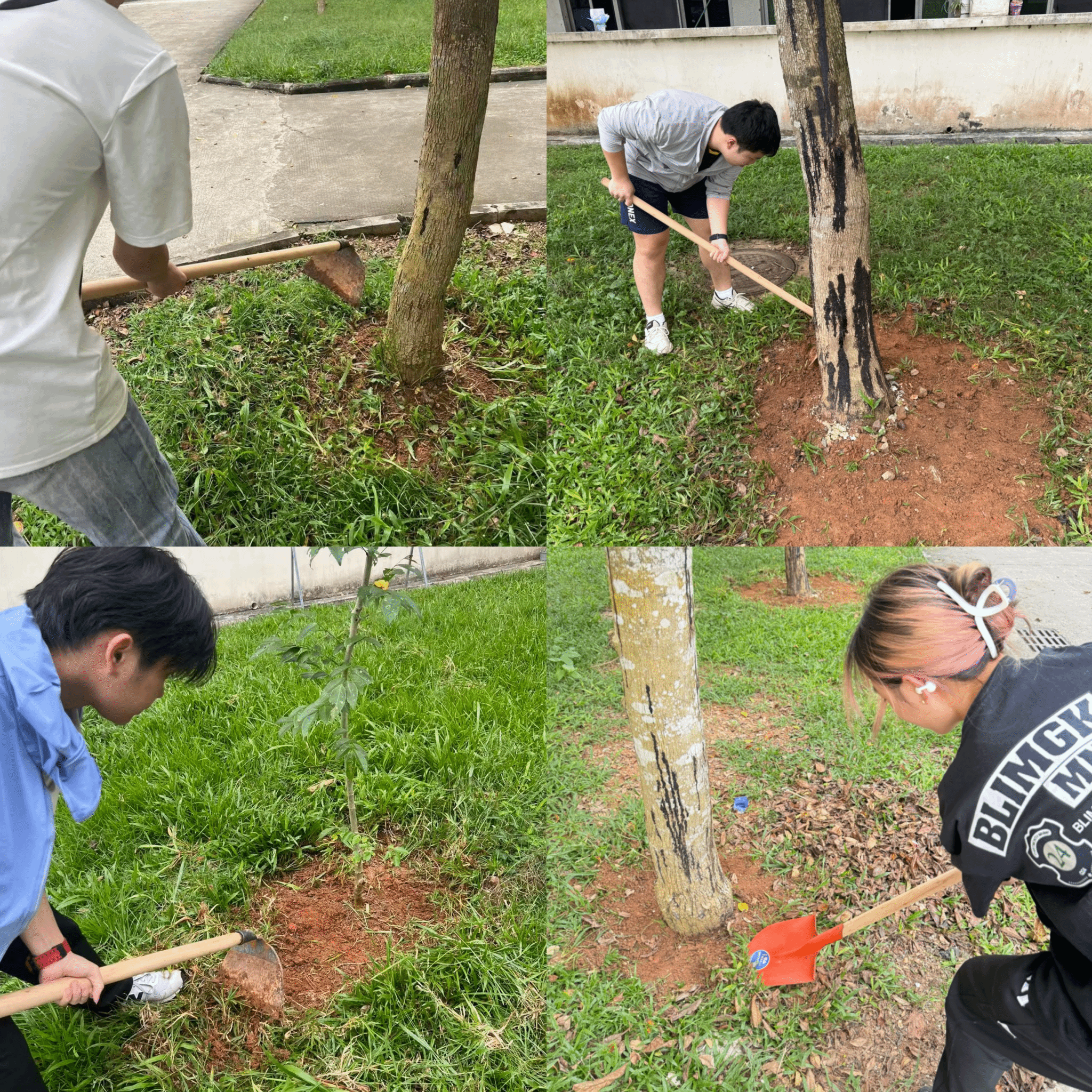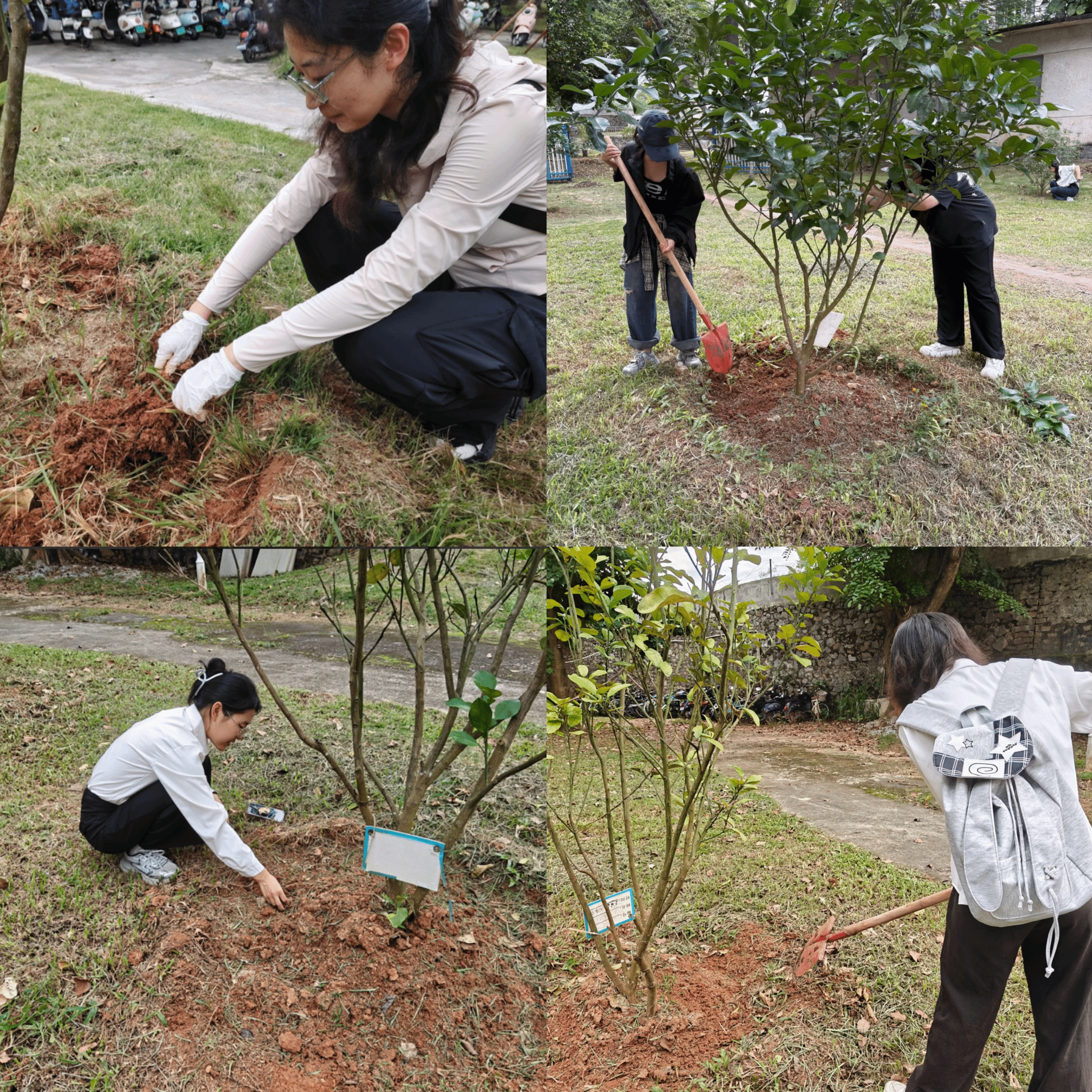 随后,支部成员前往十二栋宿舍旁和A8栋宿舍南侧开展除草养护工作。大家分工协作,细致的清理树木周边杂草,并对植株生长状况进行初步排查,在劳动中强化了实践能力与服务意识。