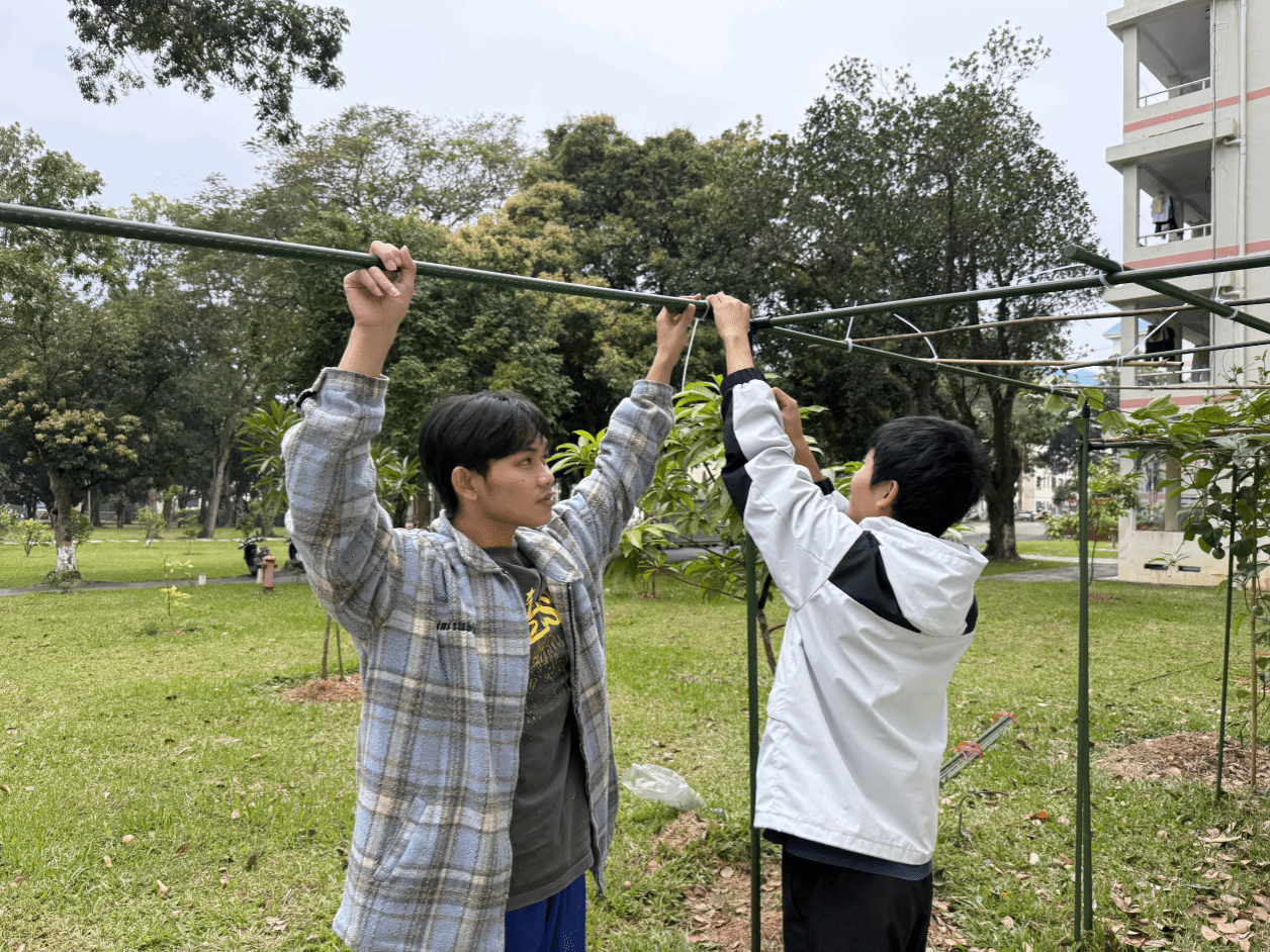 本次活动完成了百香果支架的扩建工作、对耕读区内各类植物开展浇水养护并对生长姿态歪斜的植株进行拉直、固定,全方位优化耕读区作物生长状态。