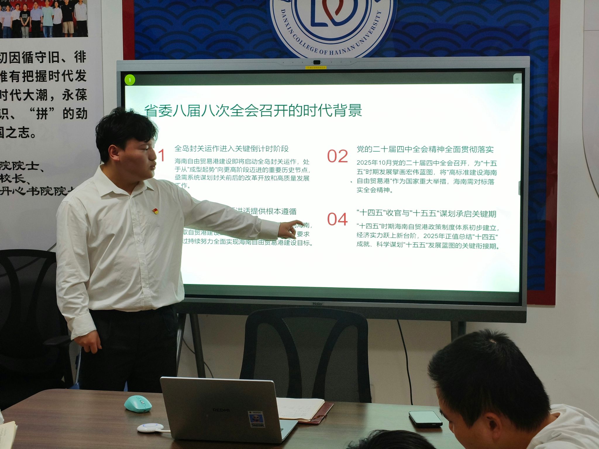 学习海南省委八届八次全会精神时,王帅结合学校办学特色与学科优势,探讨对接海南重点产业、深化校地合作的路径,助力自贸港建设提质增效。会议还传达学习海南大学党委三届三次全体(扩大)会议精神,梳理学校发展机遇与挑战,明确学科建设、人才培养等重点任务。
