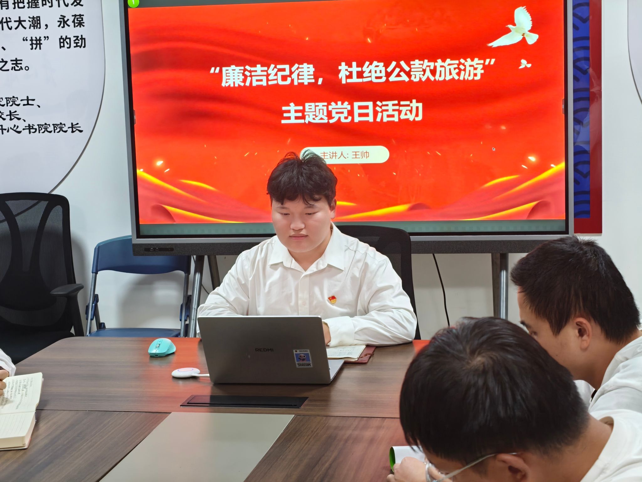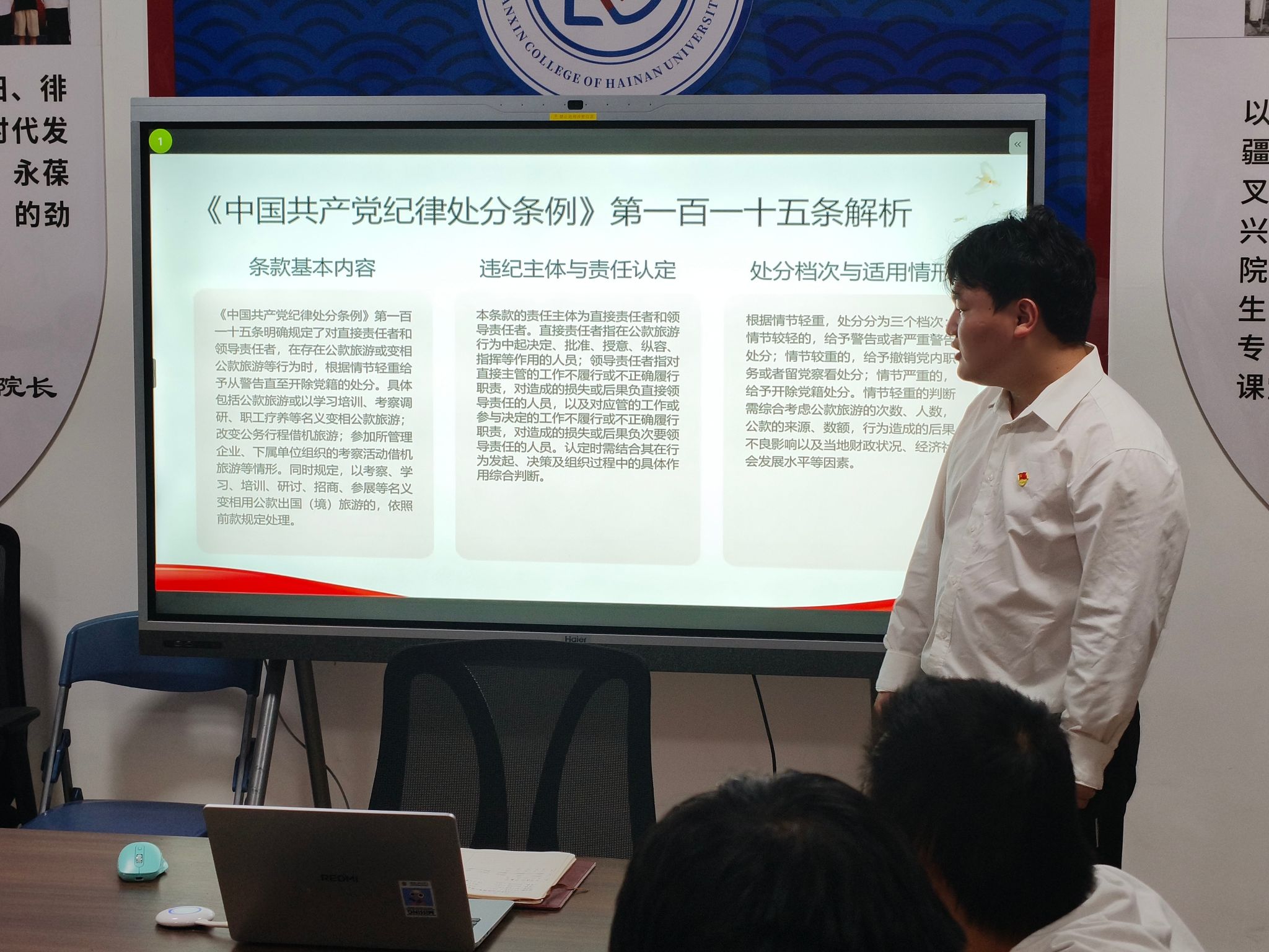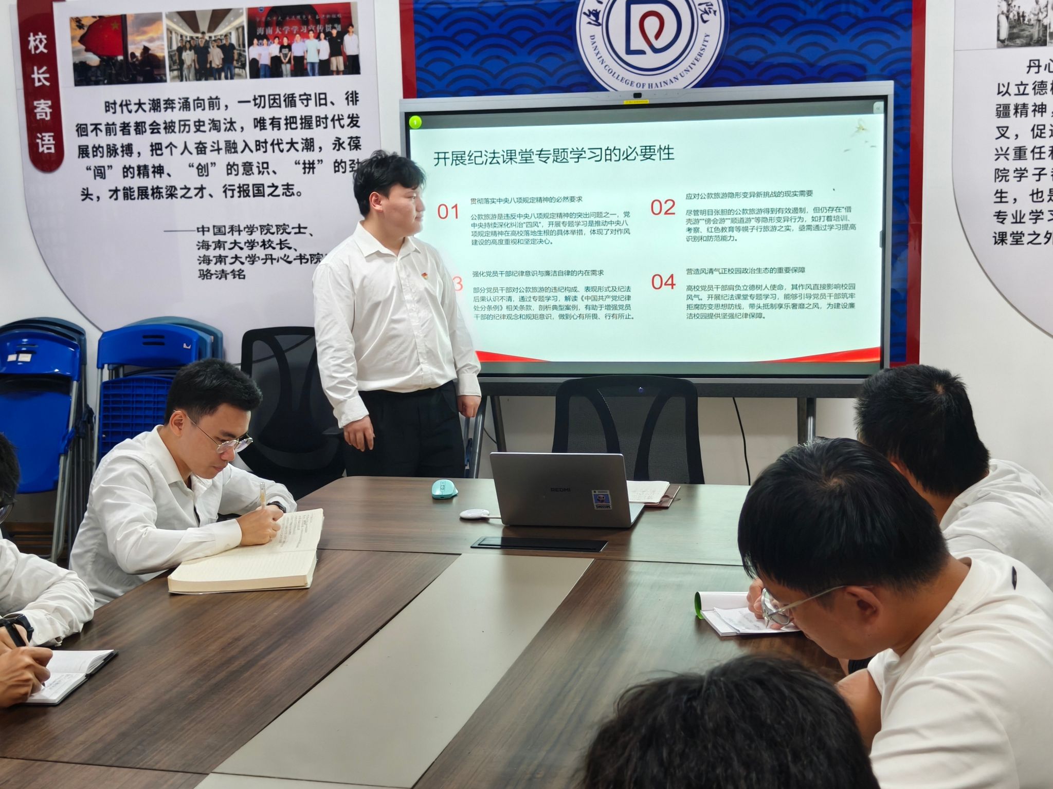 2025年12月21日晚,海南大学丹心书院第六党支部在丹心书院A9-101开展“廉洁纪律,杜绝公款旅游”主题党日活动,全体党员参与学习。
