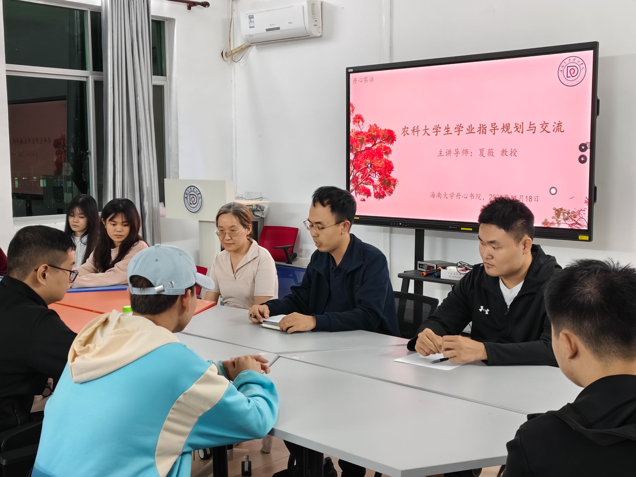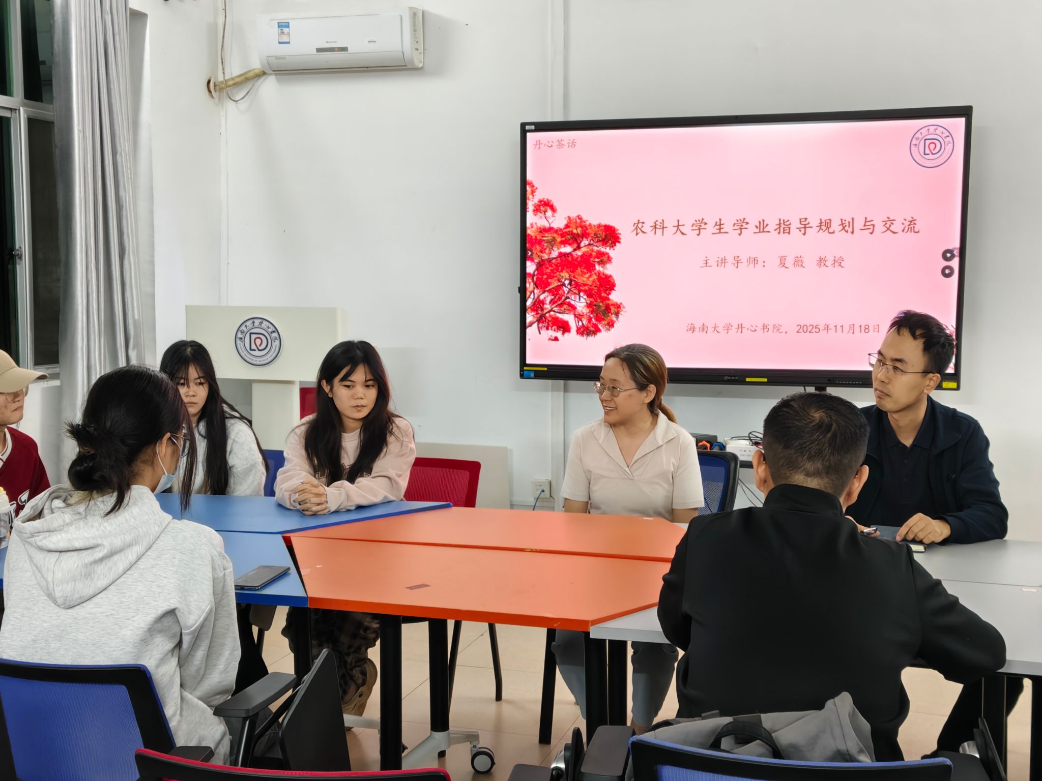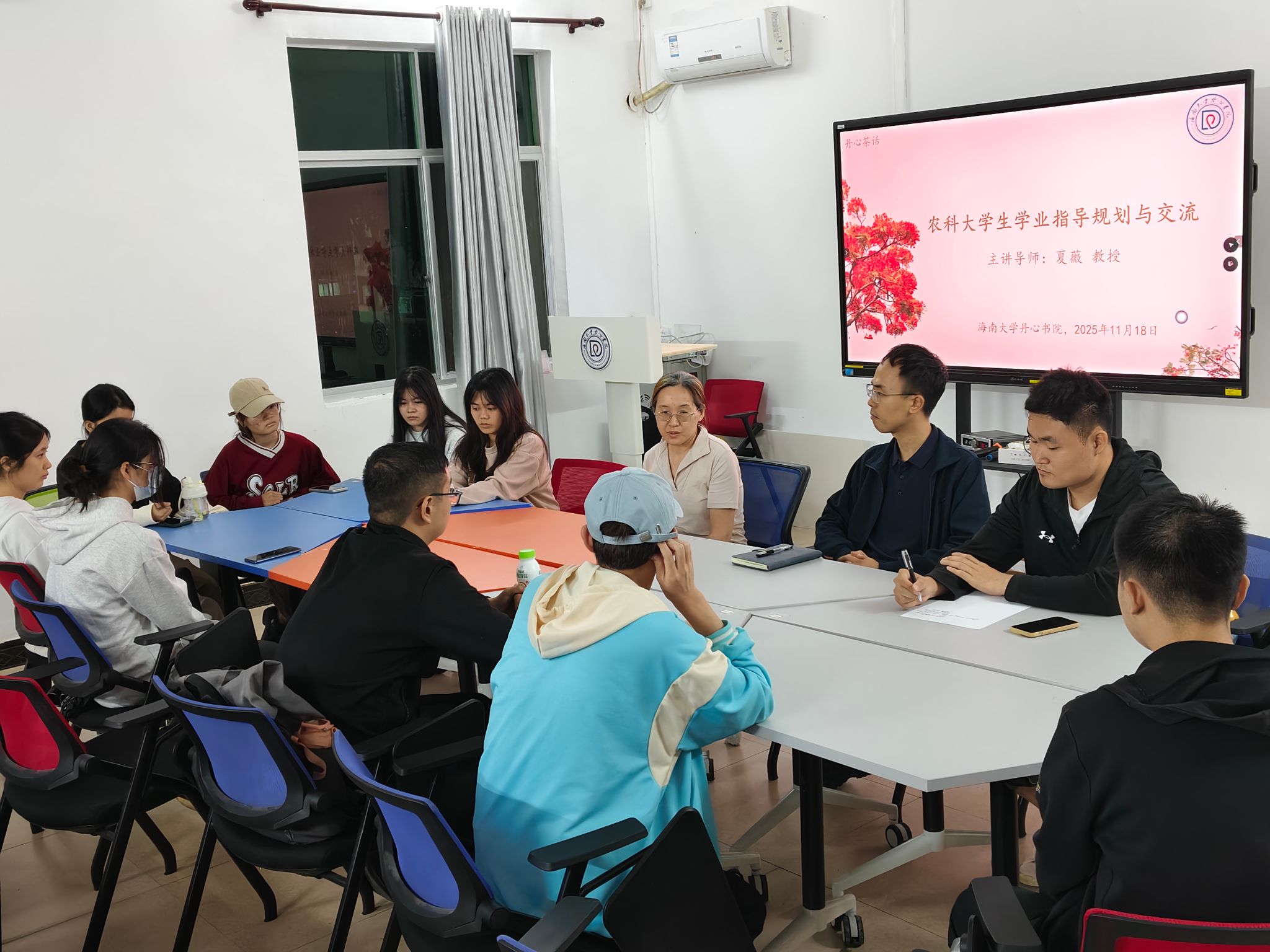 11月18日晚,“丹心茶话”第49期活动在知行楼201开展。本次活动邀请学业导师夏薇教授与同学们作交流,辅导员史翔宇老师以及2023级农艺教育专业学生参加。