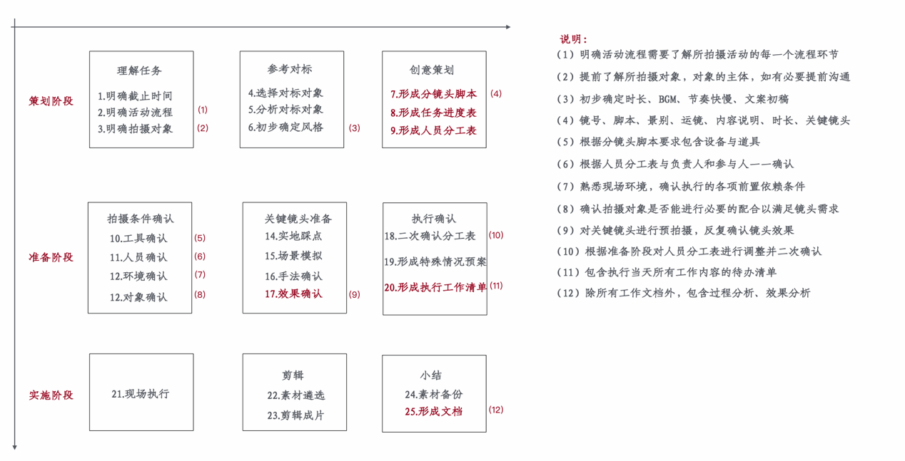 用标准作业程序将网络作品创作标准步骤固定下来,把整个团队的工作内容进行分割细化,然后逐级分发任务,形成了如下图所示的三个阶段九个环节25个控制节点与12个关键节点的执行矩阵,提升网络文化作品的生产效率的同时便于定位薄弱环节,并有针对性地进行补强。